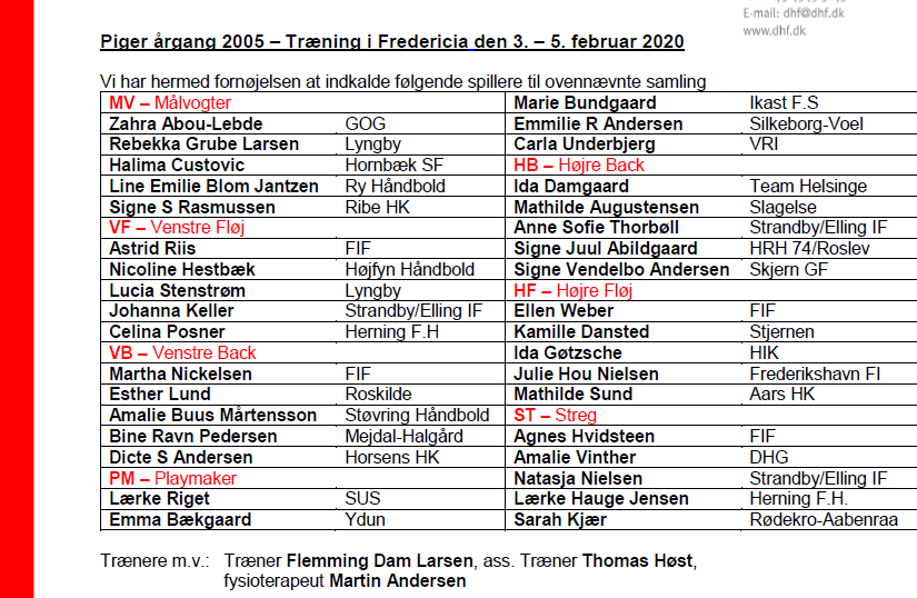 Flemming 'Tuborg' Larsen, DHF's talentansvarlige på pigesiden, har efter weekendens Iagttagelsesstævner i Øst og Vest udtaget en gruppe piger fra årgang 2005 til træning.